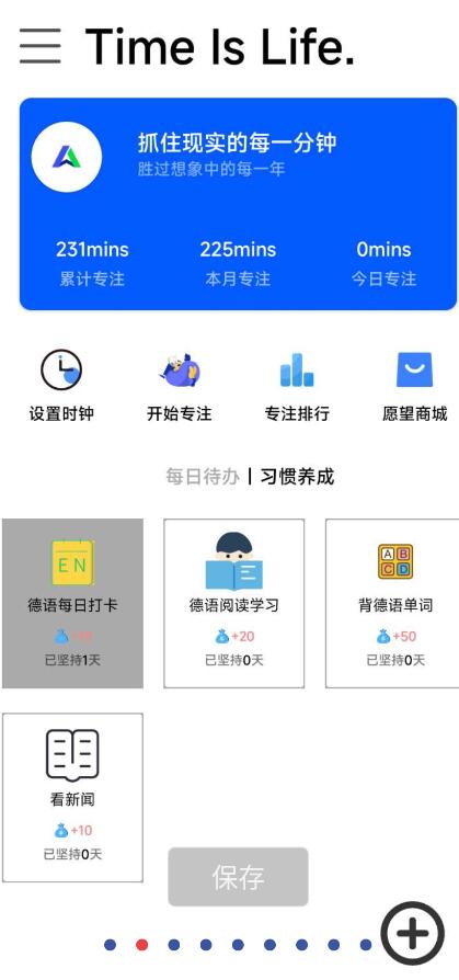软件内可以新建每日待办,新建习惯打卡。在完成待办和打卡后可以获得相应的积分,积分可用于兑换愿望商城中的商品(愿望商城中的商品均为自己添加)。