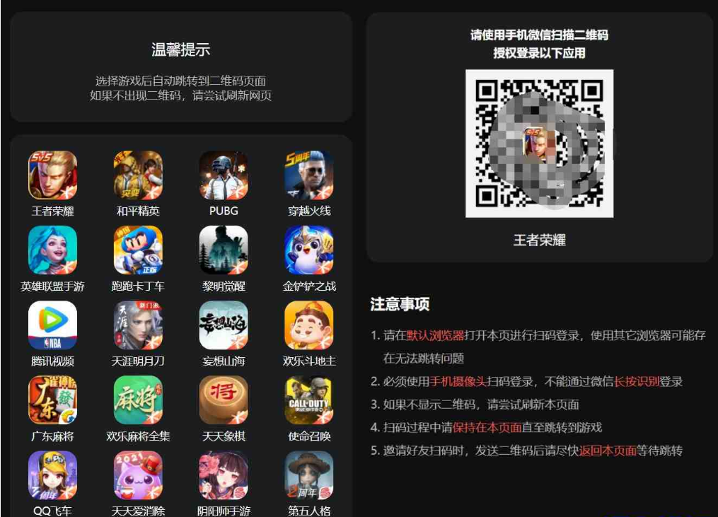 游戏扫码登录器网页版是一个款扫码上号神器,专业的游戏扫码上号登录软件,完美的解决了不上微信也能登录游戏, 目前支持王者荣耀扫码上号登录、和平精英扫码上号登录等100+款游戏,支持微信安卓、微信苹果扫码上号登录,非常方便快捷。