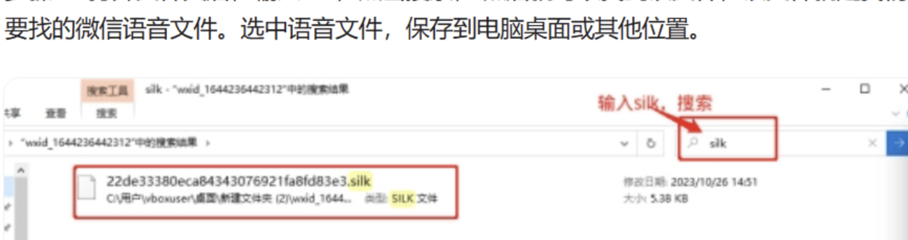 3.接着打开微信聊天记录备份路径,在当前目录下搜索silk后缀文件。(silk文件后缀没法自己改了用哈,文件编译方式不同的。)