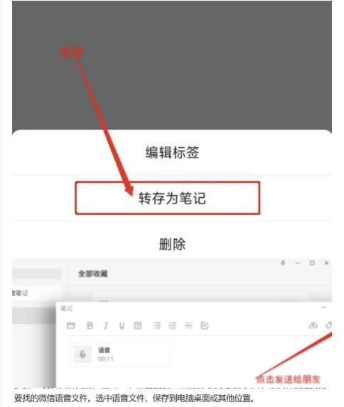1.先把对方语音保存到收藏,然后在收藏中打开转为笔记保存。(如果只想转发语音,这时候转发笔记即可,对方可收听语音)