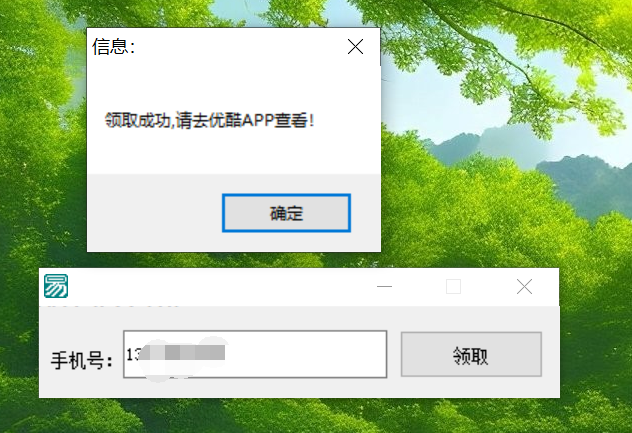 对接了优酷官网的api可以实现一键领取优酷会员一天 去掉了软件捆绑的病毒