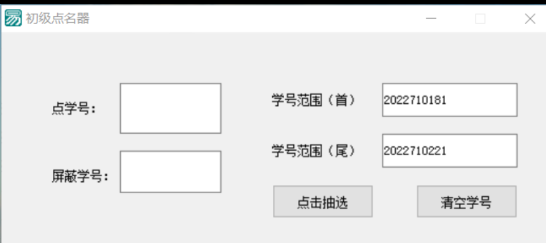 首页 > 软件仓库 > 初级点名器 可用于抽选学号,屏蔽指定学号(抽选时,屏蔽框会变为不可视状态)