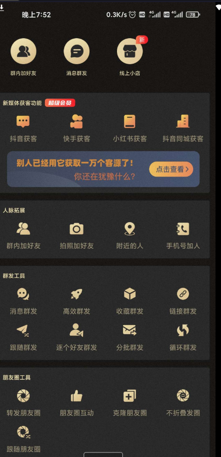 【应用简介】这是一款拥有众多功能的微商工具,为用户提供了海量高效实用的功能,包括人脉扩展、常用工具、点赞发圈、精选功能等多个分类,用户可以非常轻松的添加好友,以及群发消息。此外,该软件还推出了货源代理的服务,提供服装、美妆、鞋靴、箱包、表业等多个分类商品,用户可以选择品类和品牌来代理产品,无需担心没有货源的问题。