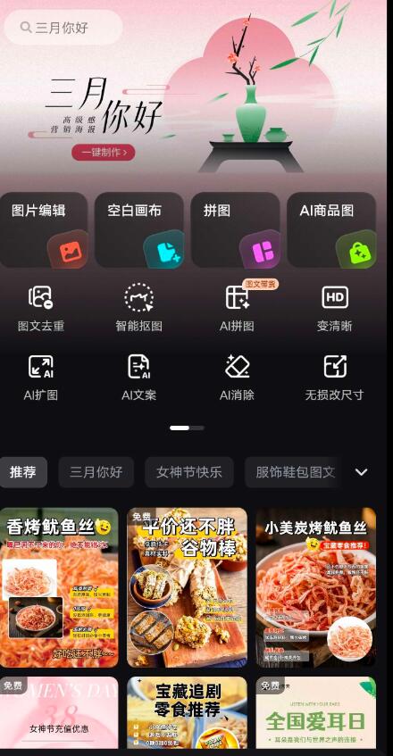 可以一键生成电商主图、公众号封面、各类绘画模板、简历模板,修改、ps图片的功能,可以代替photo shop