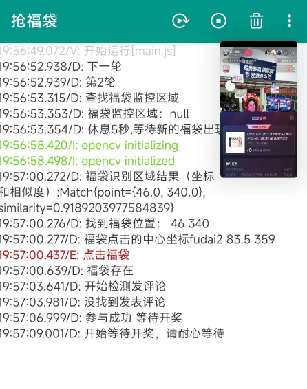 脚本运行后,手动前往直播间,找到只用发评论就可以参与的直播间,按音量加键可以停止运行,返回软件可以看到实时日志