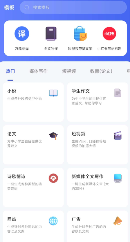 【官方介绍】:AI万能写作是一款高度自动化、智能化、个性化的AI智能软件,利用人工智能进行内容整合创作,能够一键生成各类素材内容,便捷高效地获取思路和灵感。成为你的得力创作助手,让你生活带来便利、学习更上一层、工作更加高效。 【智能创作】 大师级的创作者,写作文、文章续写、文案编写、论文大纲、公文起草、汇总报告、视频脚本、演讲稿、影评文案等更多创意 【文本优化】 输入文本内容,要点提炼、主题拆解、智能扩写等一键润色,轻松实现伪原创 【万能问答】 能帮你科学地解疑答惑,涵盖领域广泛 【工作】活动策划、竞品调研、需求文档、创业企划、广告文案,策划运营灵感源源不断,求职简历、日报周报、合同等各类模板应有尽有 【学习】 AI万能写作陪你学习英语,还能帮你翻译,外语写作等等外语知识储备俱全;我们这里有百科知识库,成为你的全能导师;更有私人专家:心理老师、宠物教学、健身教练、私厨菜谱、股票指导等等 【生活】 再也不用社恐啦!AI万能写作为您提供人际交往好手段;还能帮助您快速撰写评论轻松得返点。无论是电影、书籍还是游戏或是购物,我们提供一站式的推荐筛优,节省您的时间和精力;新手宝爸宝妈,我们也给你提供育儿大全,帮你摆脱各种育儿头疼困难。 【虚拟角色】 在AI万能写作里实现跨时空对话,这里虚拟人物多多,快来跟他们交流吧 【游戏】 我们提供多方面运势解读,还能陪你一起玩文字游戏,也能给你做一些心理年龄、性格、压力、感情类型等多领域测试 在AI万能写作中,万千需求一应俱全,为你提供强大的支持。 AI万能写作2024