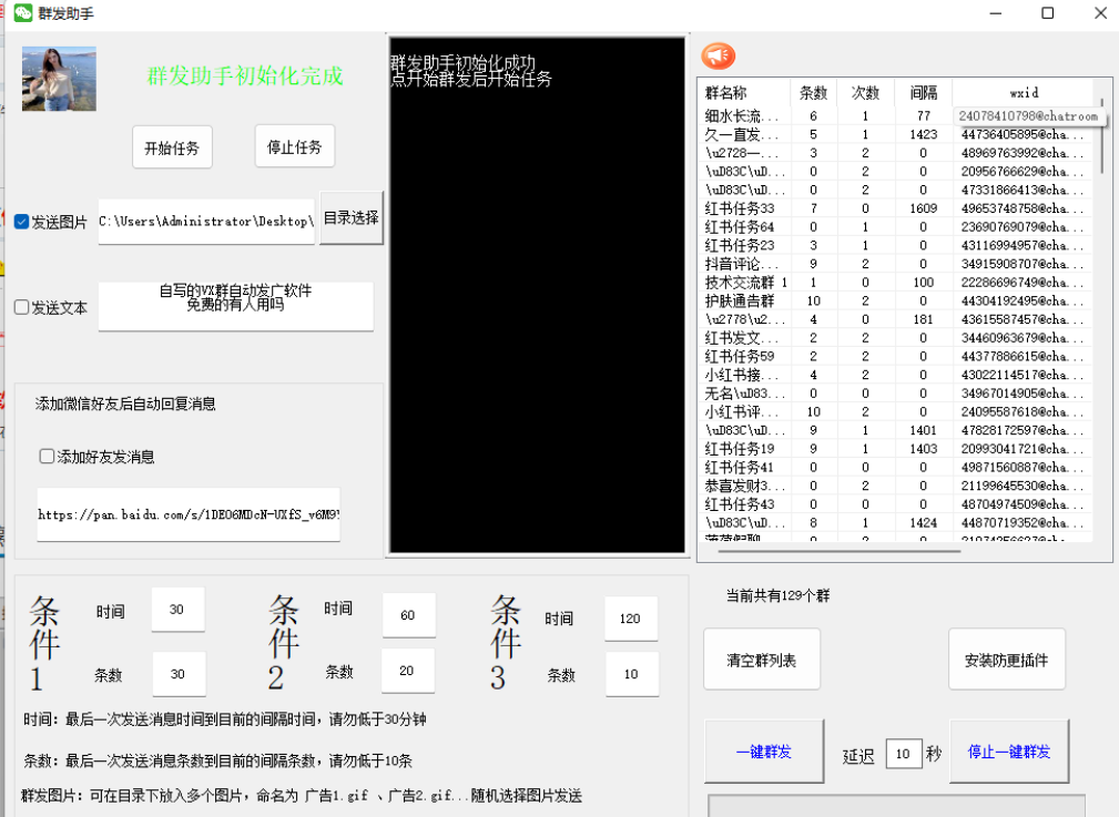 VX3.9.9.34客户Duan https://pan.baidu.com/s/1M5jTBAhe28zT4GpPjryVjw?pwd=hnu2 使用教程 1.先安装指定的VX3.9.9.34客户Duan后登录VX 2.打开群fa助手,等待获取完成VX群列表 3.点开始任务达到 条件1,条件2,条件3 后发送广告,也可点一键群fa