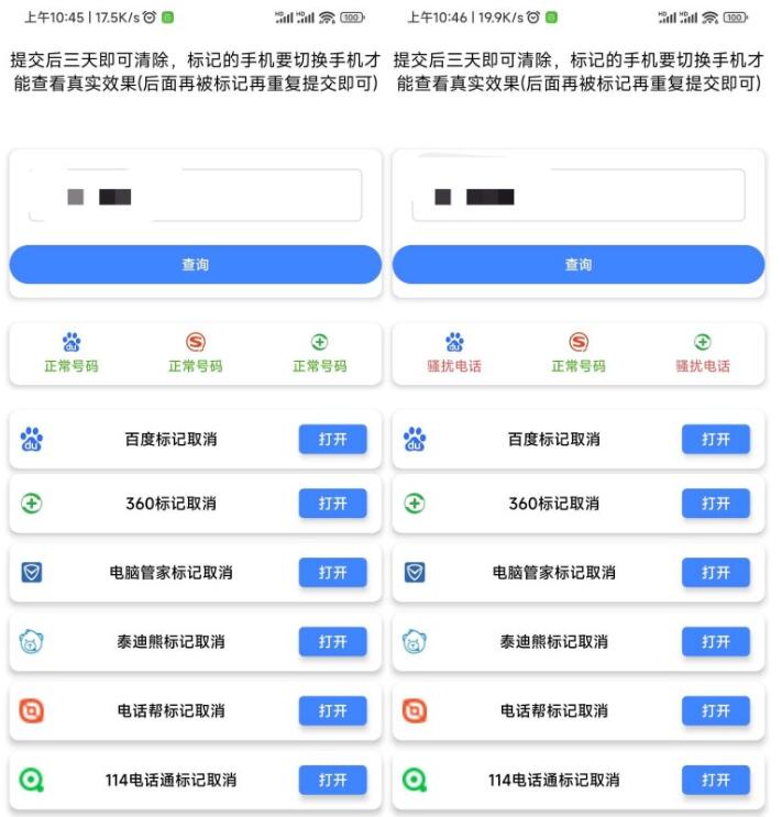【软件名称】号码标记清除 【软件版本】V2.3 【软件大小】9M 【适用平台】Android 【测试机型】小米 【软件介绍】 1.查询全网标记 2.可以清除标记 3.重复清除