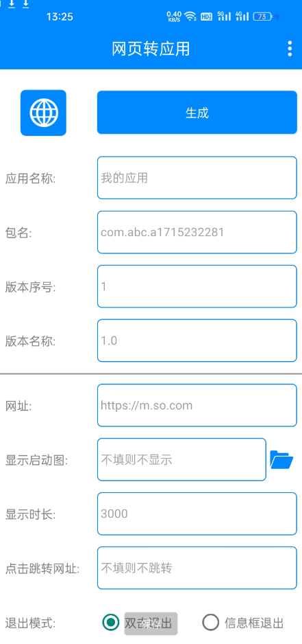 点击生成按钮即可一键将网址转换成APP应用,可自定义填写相应参数,如:应用图标、应用名称、要生成的网址、启动图等等。