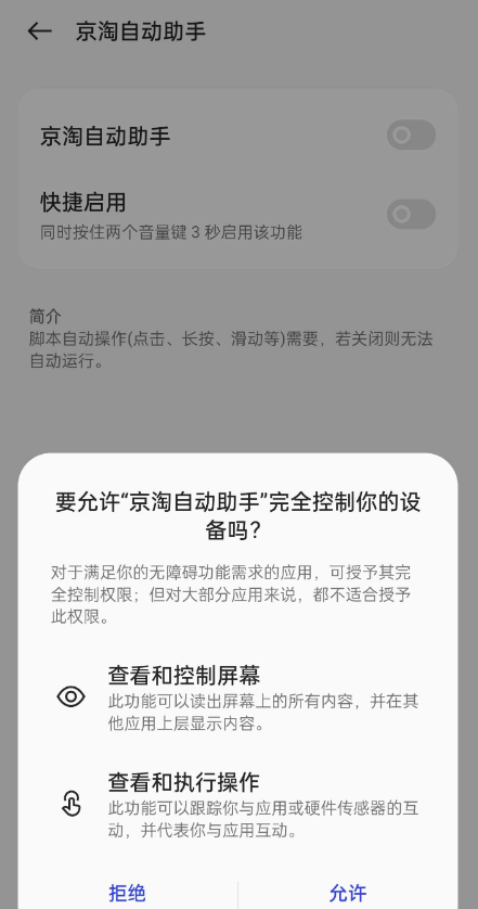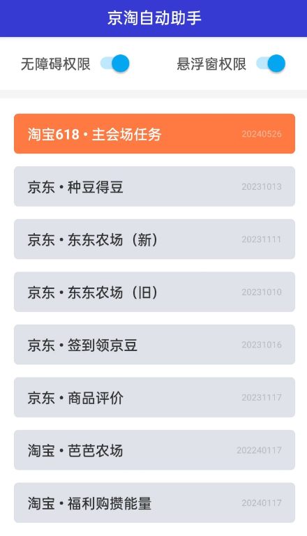 1.运行脚本之前 需要授予权限,分别为 无障碍服务 和 悬浮窗权限 (软件内点击可以自动跳转到相关页面,如果没跳转,可以手动在手机设置功能内授权)