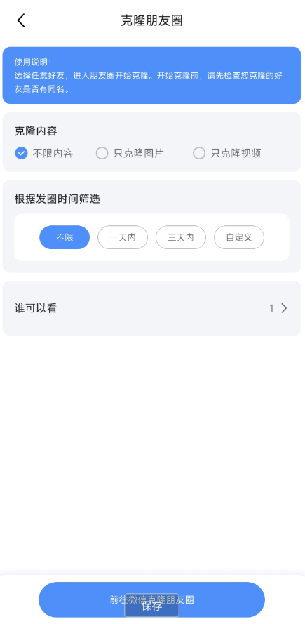 特色功能:群内加好友功能:选择群聊,智能、高效、快捷批量添加群内好友,解放双手,好友不愁,欢迎体验~1.多样性的群发功能支持微x群群发、图文群发、小程序群发、公众号群发等多种群发方式专属亲密群发,让群发也能倍有诚意专业群发微x工具箱,满足您所有的群发需求分批群发功能,您可以隔段时间后发送下一批好友,帮助您降低过度群发导致的风险。2.高效便捷的营销推广微商相册里的图片加文字一起群发,能够将消息群发给能够接受消息的对象,这个对象不限于好友还包括使用者所在的聊天群,能够极大限度将推广的效果达到极好。支持将相册中的图文与文字一起群发,将消息群发给能够接受信息的好友以及微x聊天群,极大的提升群发效率,提高推广的效果。