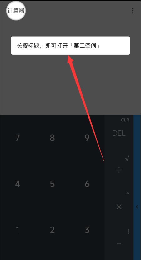 :进入第二空间方法: 长按「计算器」左上角的标题后按住 不动。