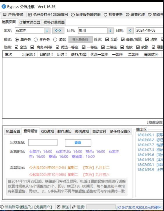 【官方介绍】:分流抢票是一款完全免费的抢票软件,全程自动抢票、自动抢候补、整点抢预售、稳定捡漏。支持多天、多车次、多席别、多乘客、多站查询、多任务等功能,支持各种提醒、选座和选铺、改签刷票、增开监控,自动支付等,更多功能敬请期待。