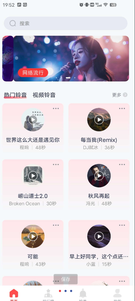 【软件简介】全网免费铃声是一款多功能铃声管理应用,它集铃声搜索、下载、制作和管理于一身,为用户提供了一个全面的铃声解决方案。这款应用不仅拥有海量的铃声资源库,满足用户对不同风格铃声的需求,还提供了铃声编辑工具,让用户可以根据自己的喜好制作个性化铃声。无论您是想要更换一个来电铃声,还是想要创作一个独一无二的专属铃声,全网免费铃声都能为您提供帮助。