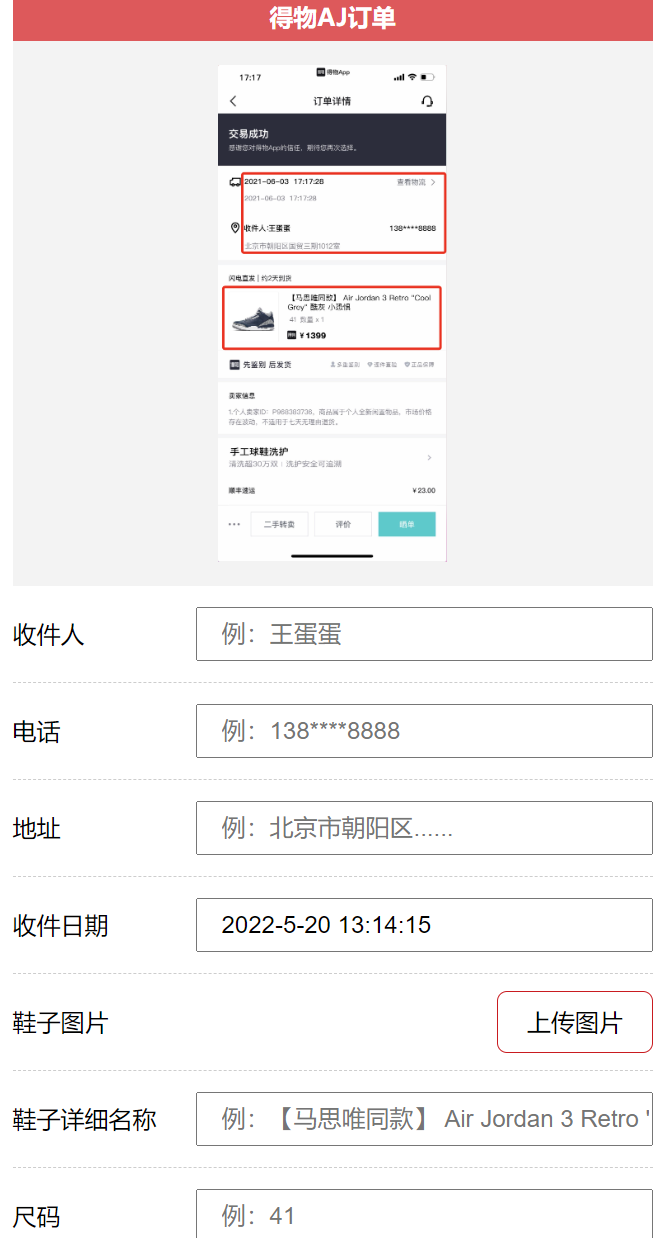 一款得物订单截图模拟器,多种模板可选,一键生成,简单快捷,满足你的各种需求,自定义商品信息、价格、收货地址等细节,高度还原真实订单,适用于社交分享、朋友间的玩笑,提升趣味性