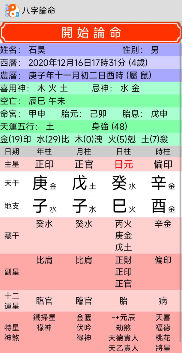 首页 > 软件仓库 > 八字论命 命理信息,包括八字干支、十神、五行、藏干、纳音、日主旺衰、大运等。