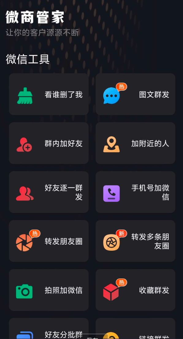 微商管家是一款专为微商、社交电商从业者与自由职业者量身定制,集客户拓展、一键群发、微商营销与社群管家于一体的微商助手软件