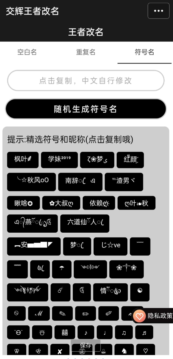 一款空白名重复名特殊符号改名APP,在线改名,改名空白名,改名重复名,改名特殊符号限制完美解决,一键修改空白名,重复名,特殊符号,改名神器,能够适合最新的游戏版本,让你们一键制作后,就可以轻松的实现空白名贵族居中效果。
