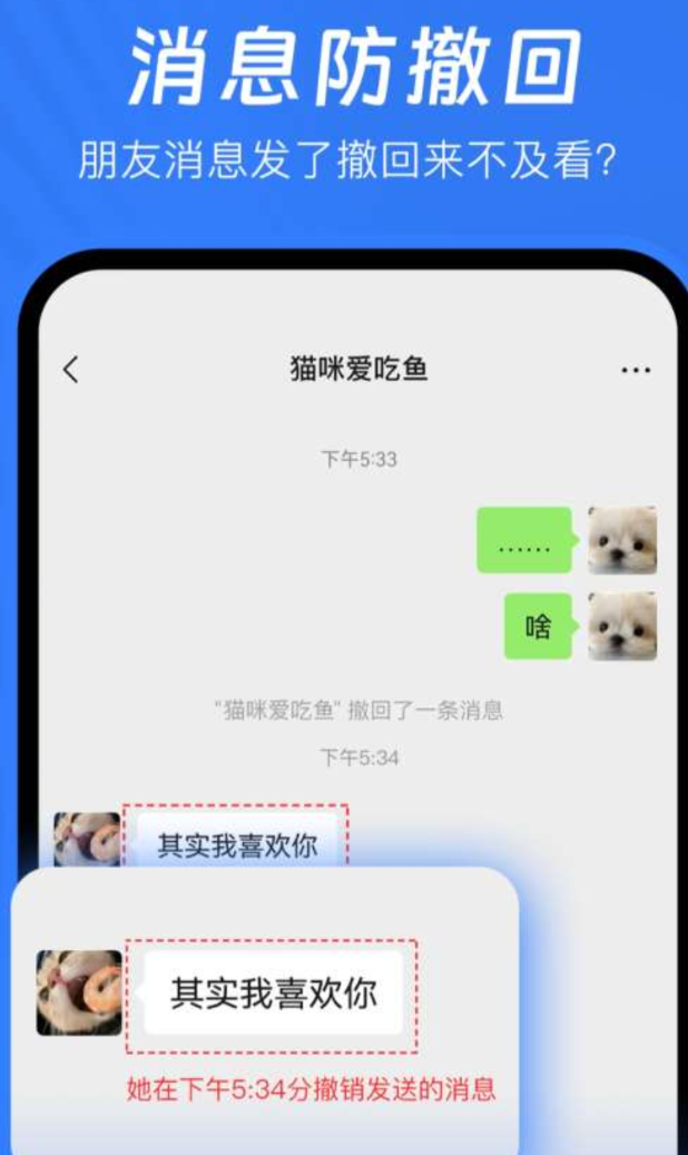 【官方介绍】:撤回不了一点是一款专为上班族、高强度上网冲浪人士设计的一款消息防撤回app,我们整合多个社交通讯软件的消息内容,让您可以轻松查看消息而不必立即回复,能够显示对方撤回的消息内容,满足您的好