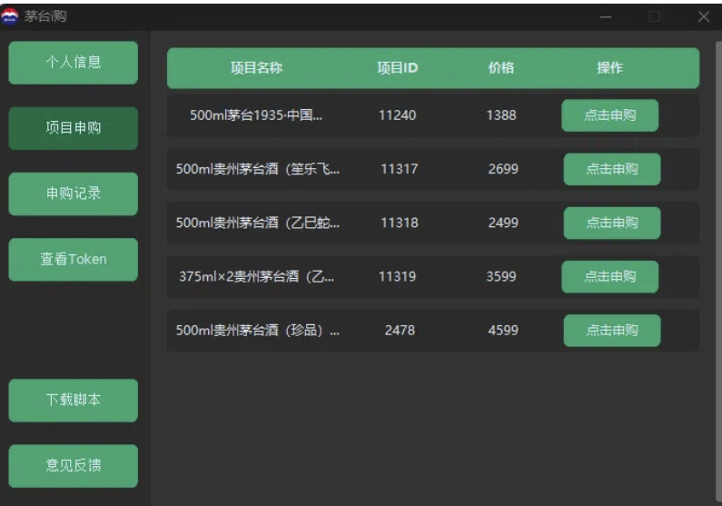 某台PC端,支持功能:申购项目、申购记录、Token和Cookie查看(用于自动申购程序使用)