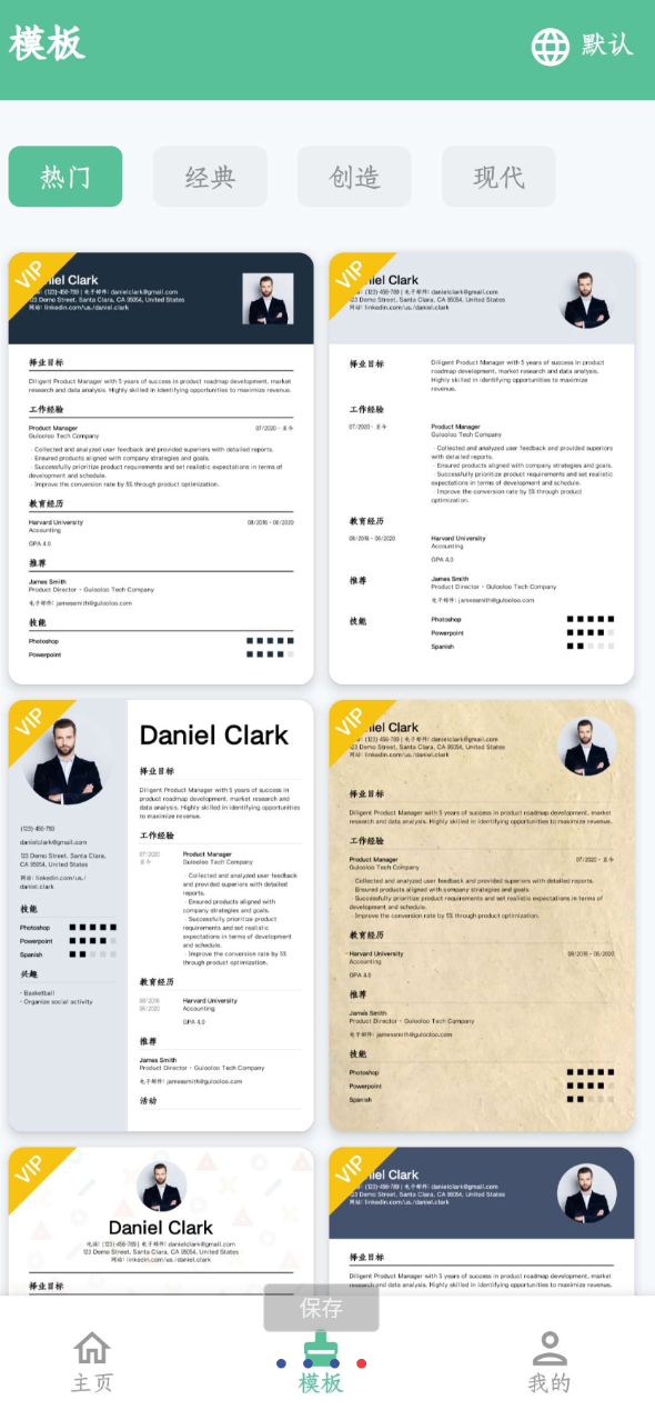 简历生成器包括简约、商务、新颖风格,还有精美实用的简历模板