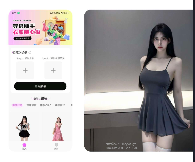 穿衣搭配助手去除VIP限制和敏感限制,随意更换衣服,选择自己的照片与想换的衣服照片,几秒内完成衣服转换。