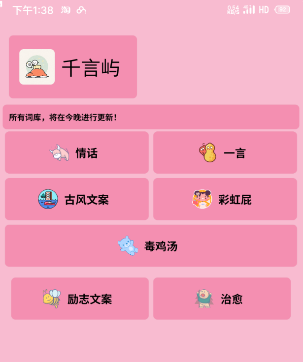 软件特色:彩虹屁、 心灵毒鸡汤、 情话、