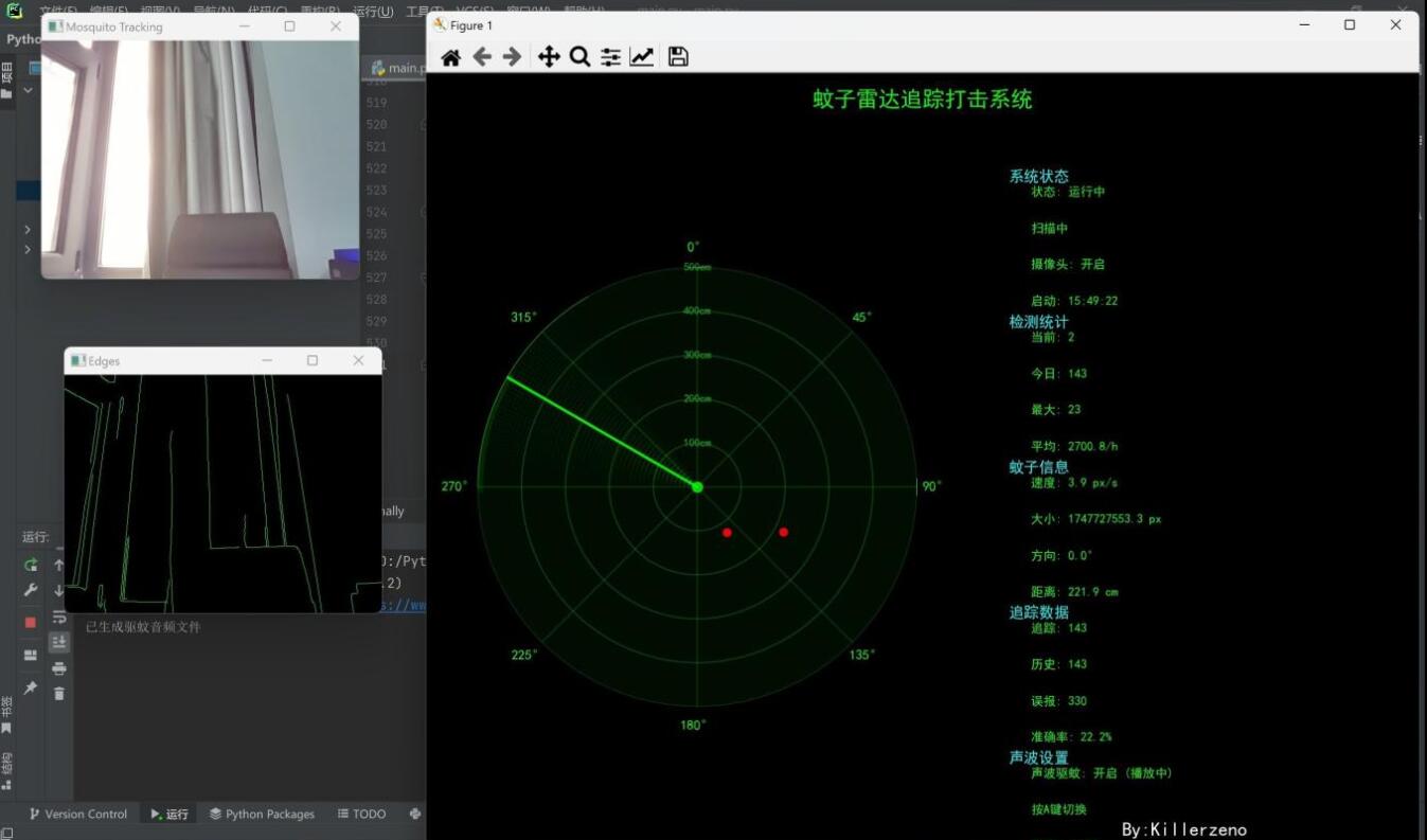 极坐标雷达图:以绿色扫描线、红色标记点显示蚊虫位置(距离 0-500cm,角度对应屏幕方位)。