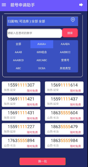 手机靓号申请助手1.0可以选全国各地市面上主流卡种,联通跟移动都可以自己选靓号
