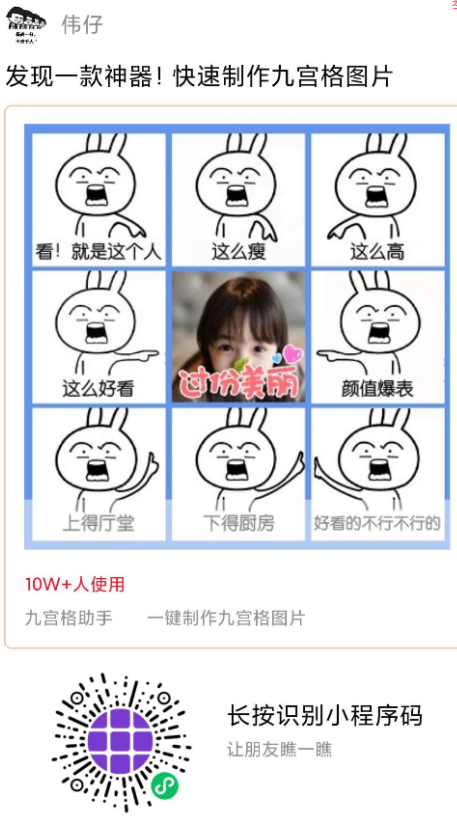 【使用方式】:直接打开微信小程序搜索“九宫格助手” 或者用微信扫描下方的小程序码哦