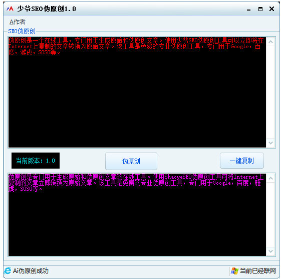 使用少爷SEO伪原创工具可以立即将在Internet上复制的文章转换为原始文章。