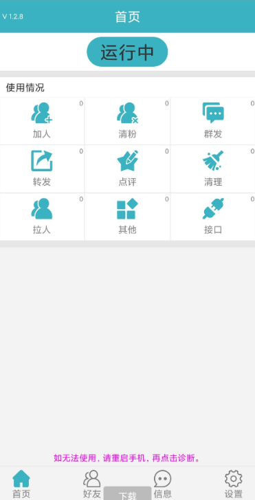 【步骤操作】点击首页已停止,打开微商利剑辅助服务,打开后显示运行中,在将微商利剑悬浮窗打开,微信即可显示功能字