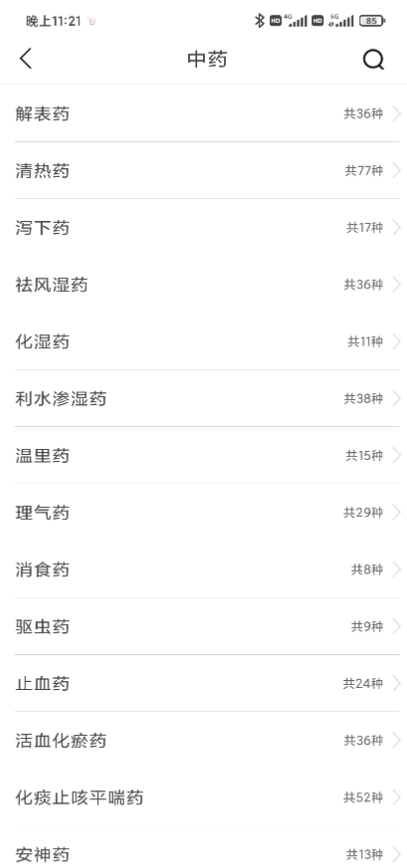 接着打开中药板块,小伙伴们可以看到,这里具备多种作用不同的中药类型,每一种都附带了相关药草,可以很清晰的了解某些药材的作用、效果、功效等等非常实用。