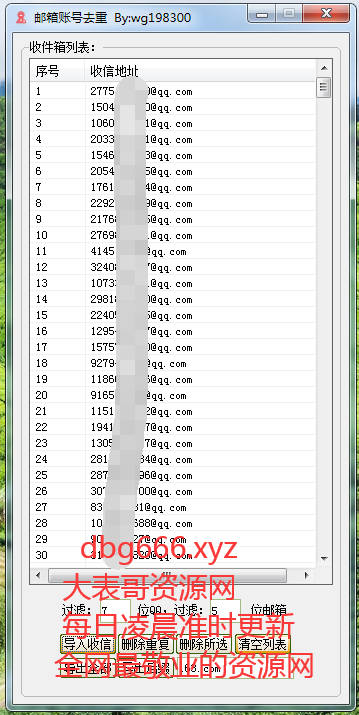 为配合邮件发送工具,批量爬回的邮箱账号数据需要进行一些整理清洗去重的工作。 使用说明 1、点击导入,邮箱数据为txt文本,一行一个邮箱账号