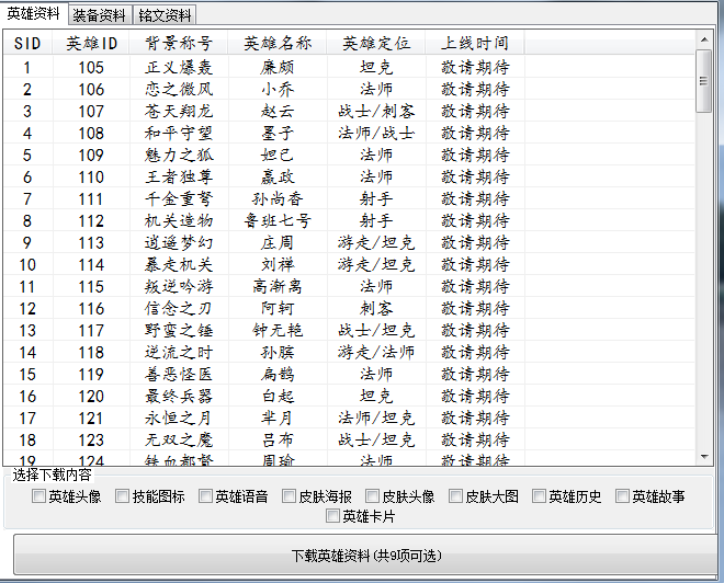 一个王者资料采集软件,可采集很多荣耀里面的东西 可采集各种资料/资源 点击任意行会播放对应的英雄语音