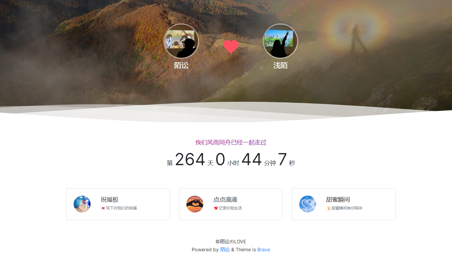 Brave主题是一款适合有对象的博主使用 ,具有计时器吝、留言板✍、恋爱清单、点点滴滴记录等功能,今天就来教大家如何搭建此类情侣博客[玫瑰][玫瑰]