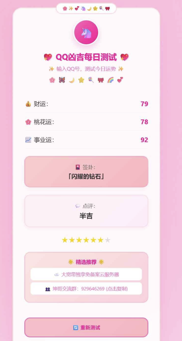【项目简介】 这是一个超级可爱的QQ每日运势测试网页应用,采用梦幻粉白色系设计, 充满少女心的界面风格,输入QQ号即可测试今日运势! 【主要功能】 • QQ号测试:输入5-12位QQ号码即可开始测试 • 三大运势指标:财运、桃花运、事业运数值评分(1-100分) • 签卦系统:随机生成各种有趣的签卦结果 • 星级评价:根据综合运势显示1-7颗星评级 • 一键复制QQ群号功能 【设计特色】 • 粉白梦幻渐变背景 • 独角兽主题头像 • 大量可爱emoji装饰元素 • 毛玻璃效果和柔和阴影 • 响应式设计,适配手机和电脑 【使用方法】 1. 输入您的QQ号码(5-12位数字) 2. 点击"开始测试"按钮 3. 查看您的今日运势结果 4. 可以点击"重新测试"测试其他QQ号 【技术特点】 • 纯前端HTML应用,无需服务器 • 基于QQ号和日期的伪随机算法 • 同一QQ号每天结果固定但不同天会变化 • 所有计算在本地进行,不收集任何数据 夸克云盘:https://pan.quark.cn/s/b8383f2b9012 123云盘:https://www.123912.com/s/TlNqjv-9Z8qd 百度云盘:https://pan.baidu.com/s/1qe0ricWQymewsR5NybmutA?pwd=hrxq 提取码: hrxq